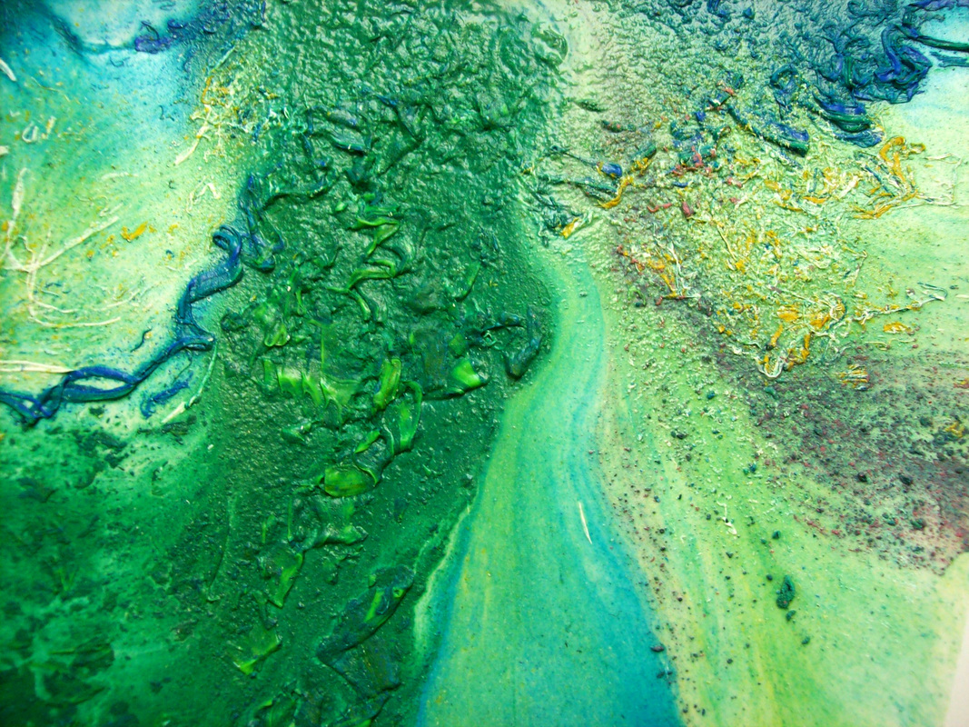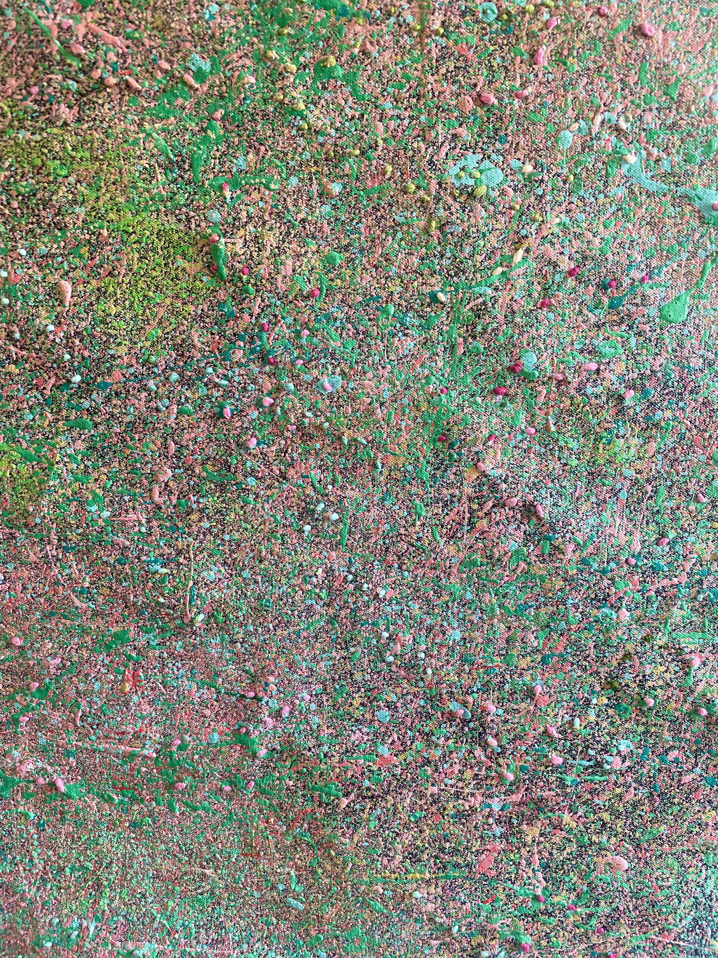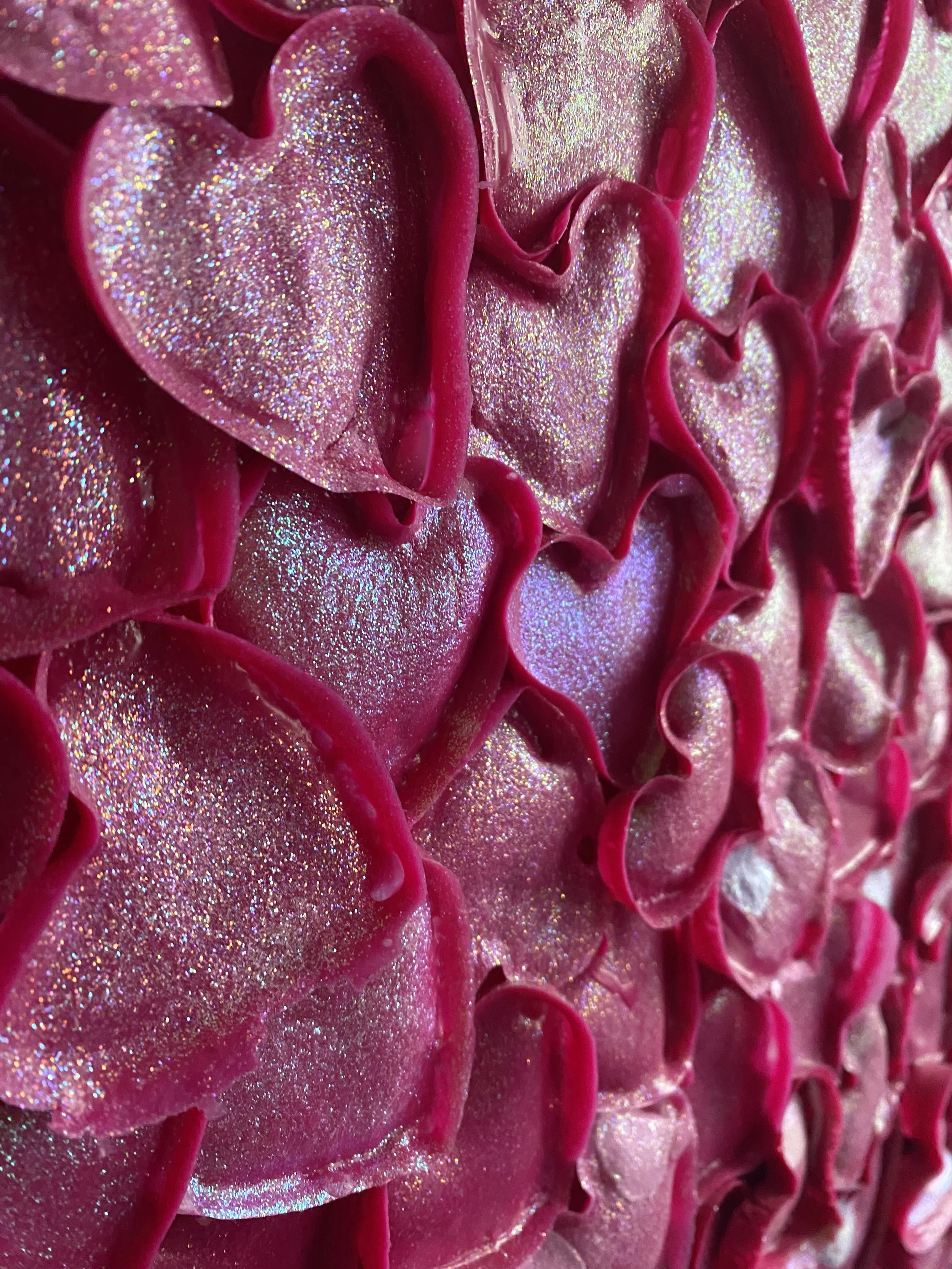 This expansive work is composed entirely of hand-manipulated acrylic paint, embellished with glitter and sequins. Built through a process of layering, peeling, and reconfiguring dried paint, the piece occupies a space between painting and sculpture. The surface glimmers with reflected light, drawing attention to its tactile richness and the tension between fragility and flamboyance.