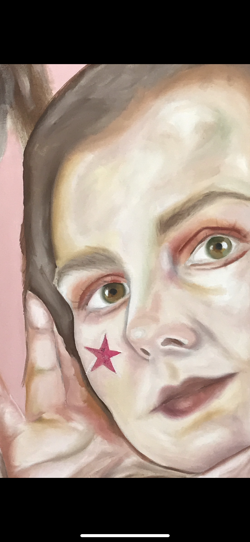 I'm Just a Girl presents a figure mid-pose, blowing a bubblegum bubble while sequins shimmer across her cheeks. At once lighthearted and sharply observant, the painting becomes a meditation on the everyday resilience of girlhood — particularly under economic strain. The sequins both embellish and disrupt, marking the face with a kind of defiant care. In line with Somerset’s broader approach, the work blurs the boundary between sincerity and irony, allowing gesture, surface and context to speak simultaneously.