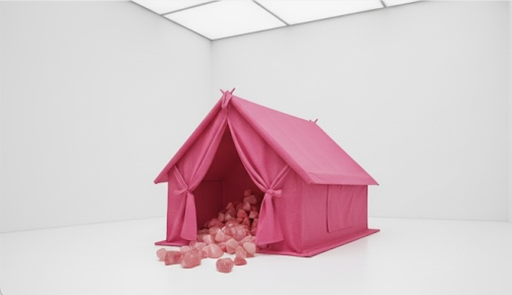 Sublime Womanhood is a sculptural installation series that explores the hidden abuse embedded within culturally idealised notions of femininity and domestic safety. At first glance, the pink fabric dollhouse tent suggests innocence, play, and stereotypical girlhood. But as the tent doors open to reveal sharp pink rocks tumbling out, the illusion shatters.