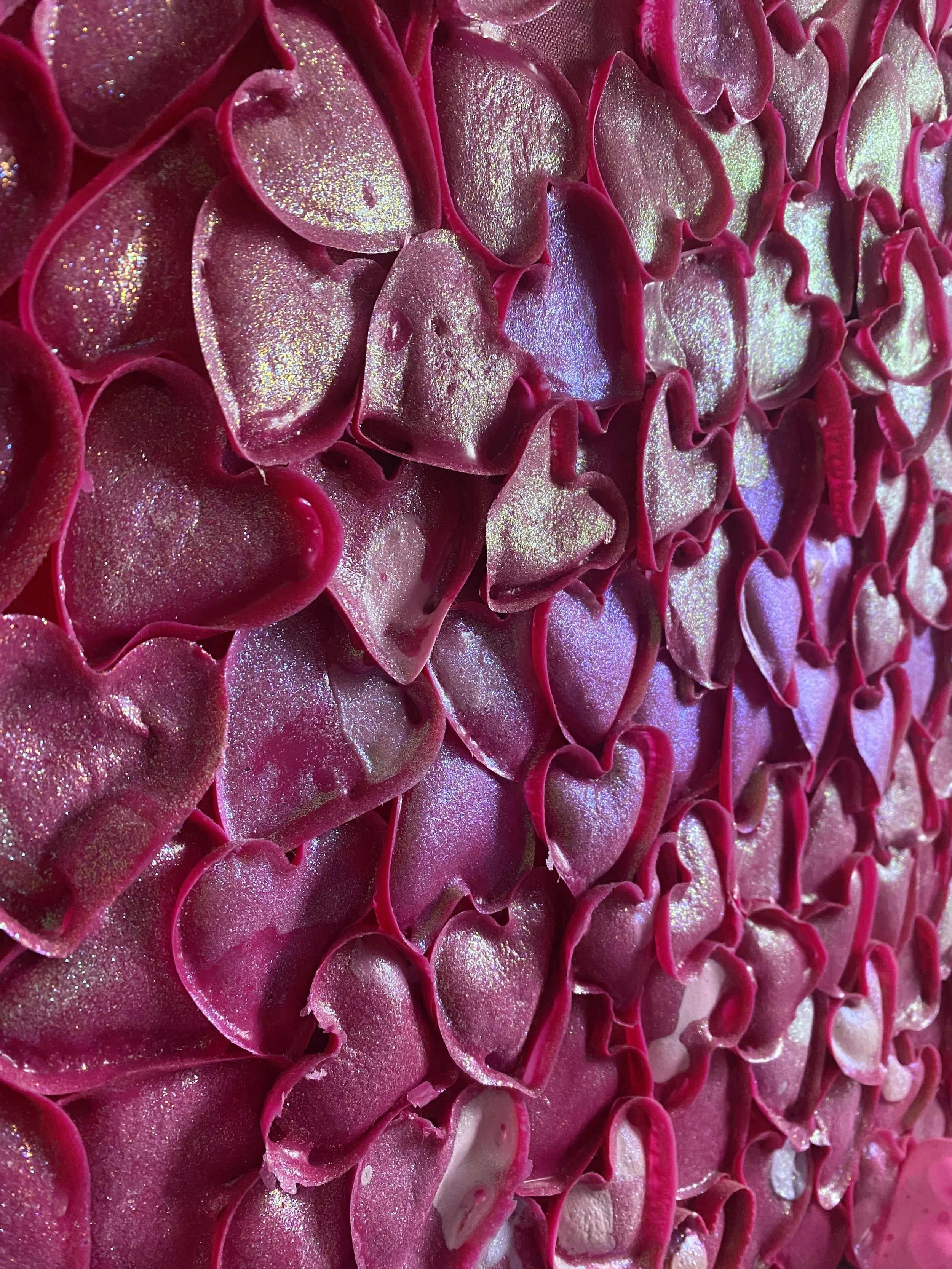 The large surface is consumed by hundreds of deep-pink, glittering hearts. While the color and overwhelming scale create an initial aesthetic of feminine abundance and sweetness, the hearts themselves are hollow.